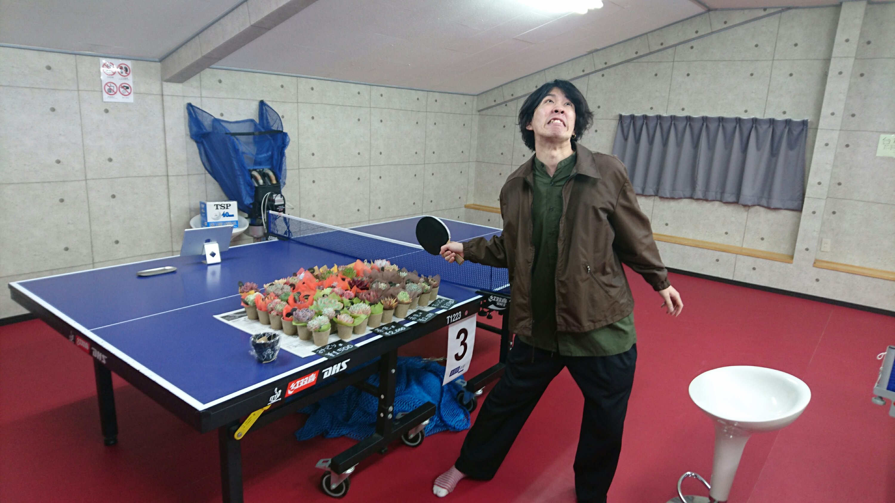 卓球台の上にキレイに並べさせていただいています。