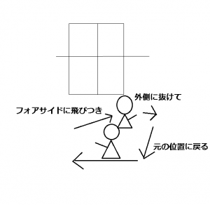 そのまま後ろに下がってしまうとパートナーが回りこみで対応するときに