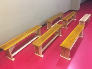 新卓球場の木の温もりたっぷりのベンチは全て斉藤パパの手作りです。