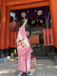 七五三の時の写真のようです。ピースがおぼつかないのが可愛い。