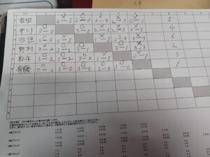 この人数の場合は3セット先取5セットマッチの全員総当りで試合を行います。